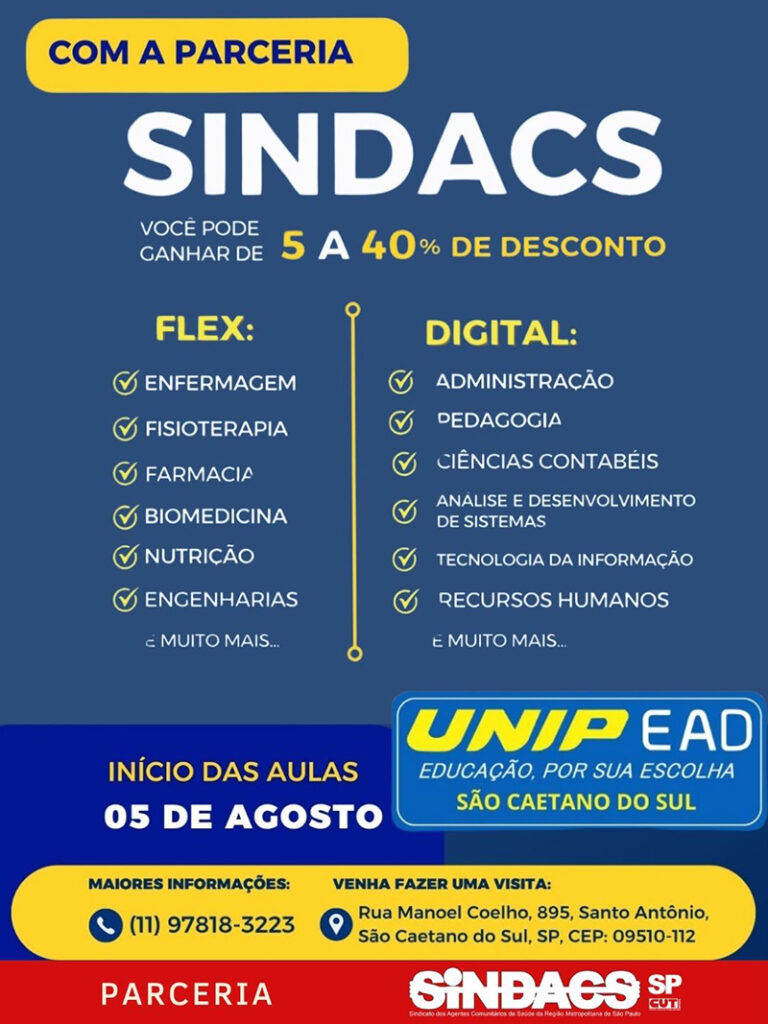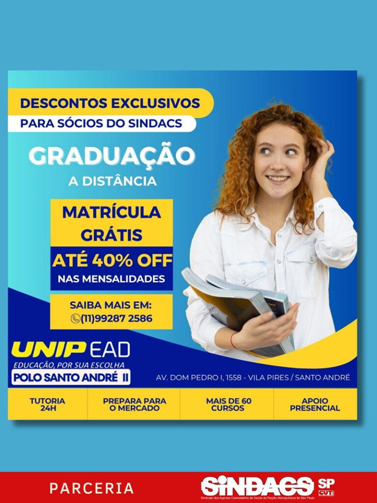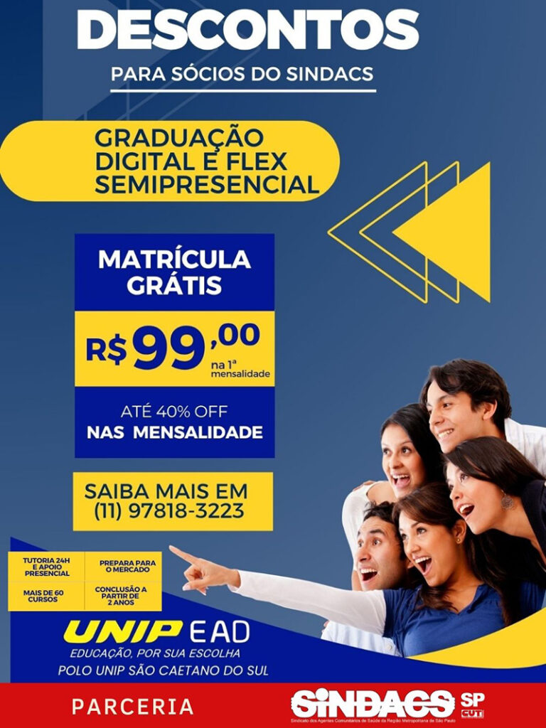 A Faculdade UNIP (Universidade Paulista), oferece o desconto de 5% a 10%, dependendo da modalidade de estudo para os associados(as) e dependentes. www.unip.br